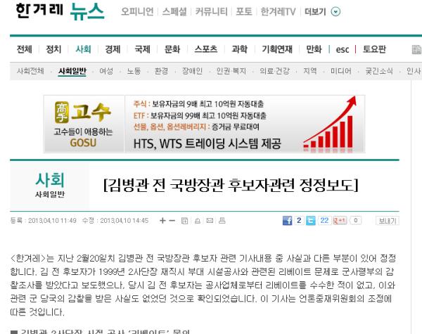 ¡º<ÇѰܷ¹>´Â Áö³ 2¿ù20ÀÏÄ¡ ±èº´°ü Àü ±¹¹æÀå°ü Èĺ¸ÀÚ °ü·Ã ±â»ç³»¿ë Áß »ç½Ç°ú ´Ù¸¥ ºÎºÐÀÌ ÀÖ¾î Á¤Á¤ÇÕ´Ï´Ù. ±è Àü Èĺ¸ÀÚ°¡ 1999³â 2»ç´ÜÀå ÀçÁ÷½Ã ºÎ´ë ½Ã¼³°ø»ç¿Í °ü·ÃµÈ ¸®º£ÀÌÆ® ¹®Á¦·Î ±º»ç·ÉºÎÀÇ °¨ÂûÁ¶»ç¸¦ ¹Þ¾Ò´Ù°í º¸µµÇßÀ¸³ª, ´ç½Ã ±è Àü Èĺ¸ÀÚ´Â °ø»ç¾÷ü·ÎºÎÅÍ ¸®º£ÀÌÆ®¸¦ ¼ö¼öÇÑ ÀûÀÌ ¾ø°í, ÀÌ¿Í °ü·Ã ±º ´ç±¹ÀÇ °¨ÂûÀ» ¹ÞÀº »ç½Çµµ ¾ø¾ú´ø °ÍÀ¸·Î È®ÀεǾú½À´Ï´Ù. ÀÌ ±â»ç´Â ¾ð·ÐÁßÀçÀ§¿øÈ¸ÀÇ Á¶Á¤¿¡ µû¸¥ °ÍÀÔ´Ï´Ù. ¡»